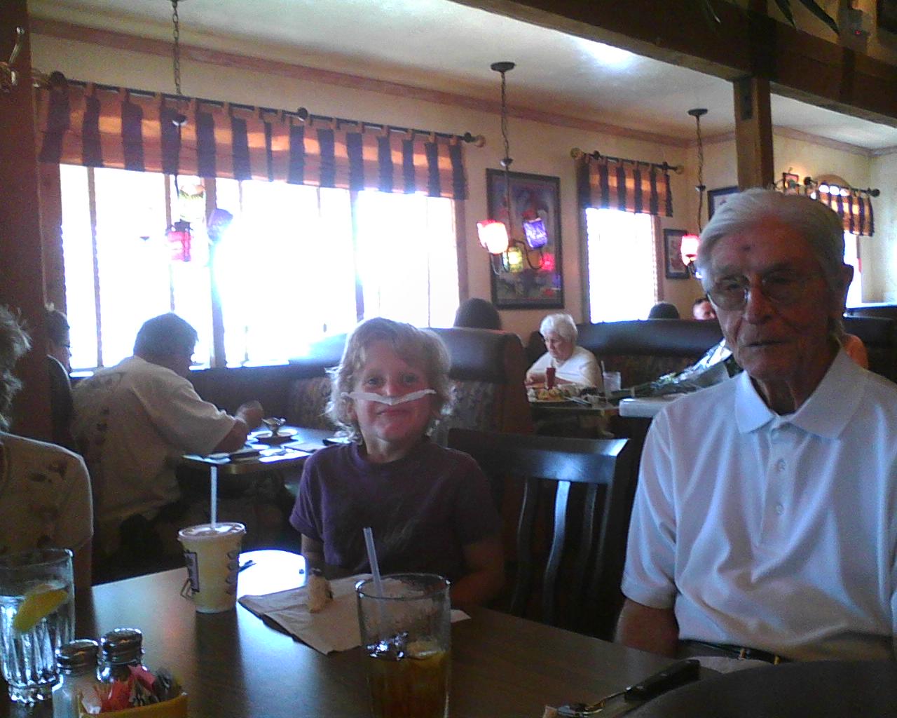 Dad’s getting a kick out of his great-grandson, Carter’s, newfound ability to sniff a straw wrapper and make it look like a mustache.