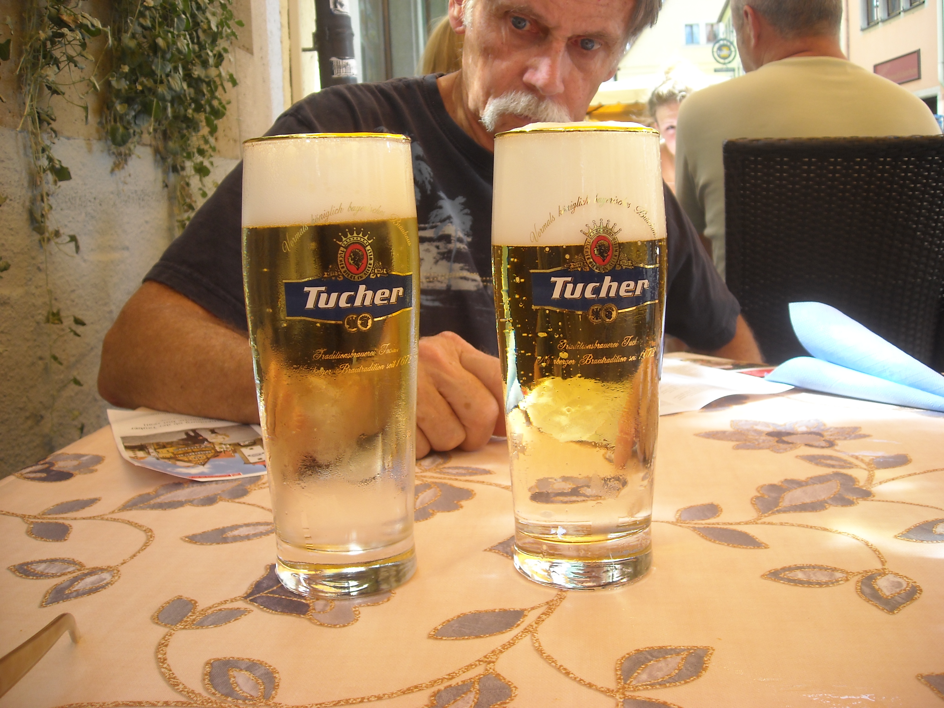 It was kind of hot the day we visited so a Radler beer hit the spot. These are wheat beers mixed with lemonade, sprite, coke, or whatever sounds good. Sounded awful to us at first but so far have tried all three and now we’re fans. The round dumpling-like things on Charlie’s plate are Kloss…a ball formed by cooked and raw potato, mixed with a special flour that holds it all together. Andrea fixed some for our dinner and they were tasty with gravy.