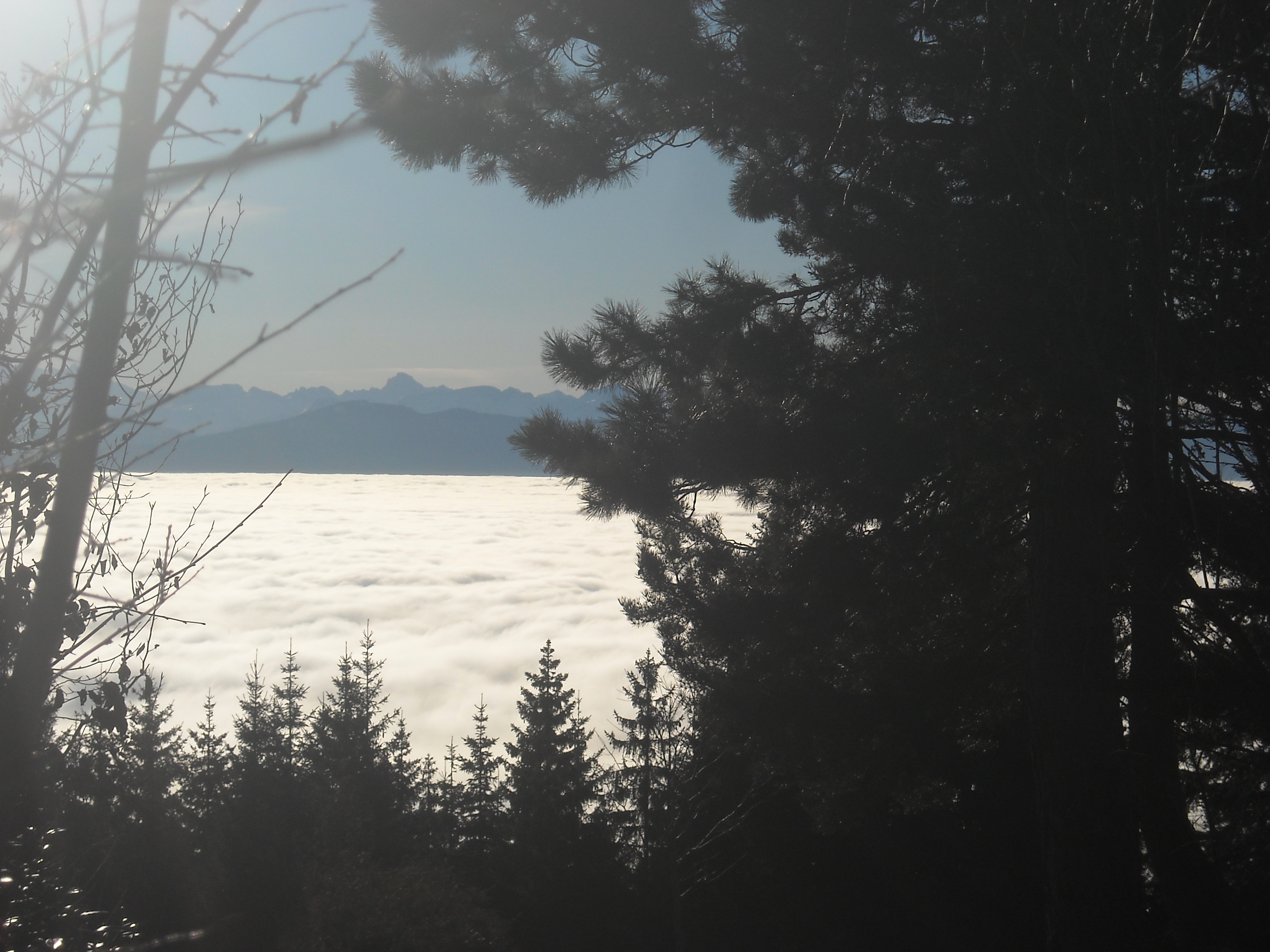 I could have stood there all day but then Charlie came running around the bend and, when spotted by the chamois, they started to move on in a pack, walking across the grass onto a large patch of snow. This is a sight and experience I hope to remember forever…the cold, crisp air combined with the view of Mont Blanc, a thick, white layer of cloud hanging over Lake Geneva, and a herd of chamois grazing right in front of me. Life is good!