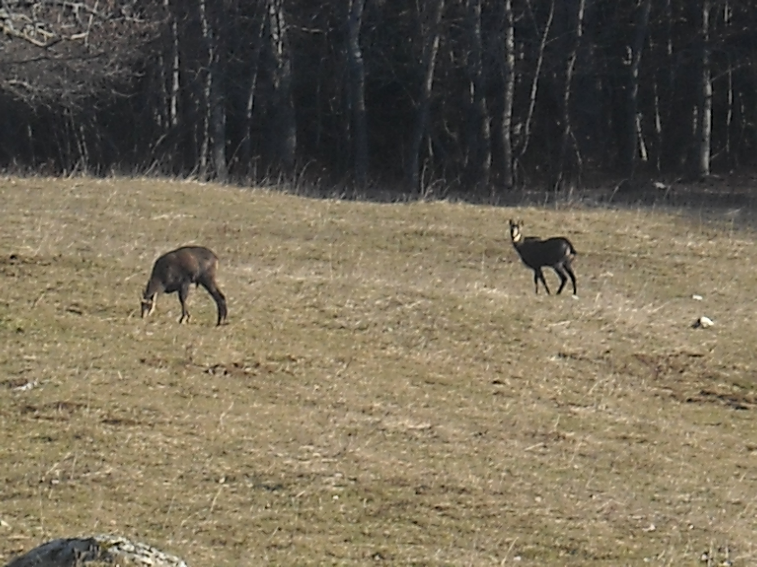 Our new friend, Joy, told us about the chamois gathering there to munch on the grass, so I was hoping to spot one or two along the way. Reaching the field in front of the houses, sure enough, I spotted two at the bottom of the hill. They took notice of me but did not run off and continued eating. The sun was behind them so photos were impossible. Only thing to do was head down the hill to the side of them, far enough away as not to scare them, but close enough to get a couple of pictures. This plan worked and they weren’t too nervous, but kept an eye on me while they munched the grass below.