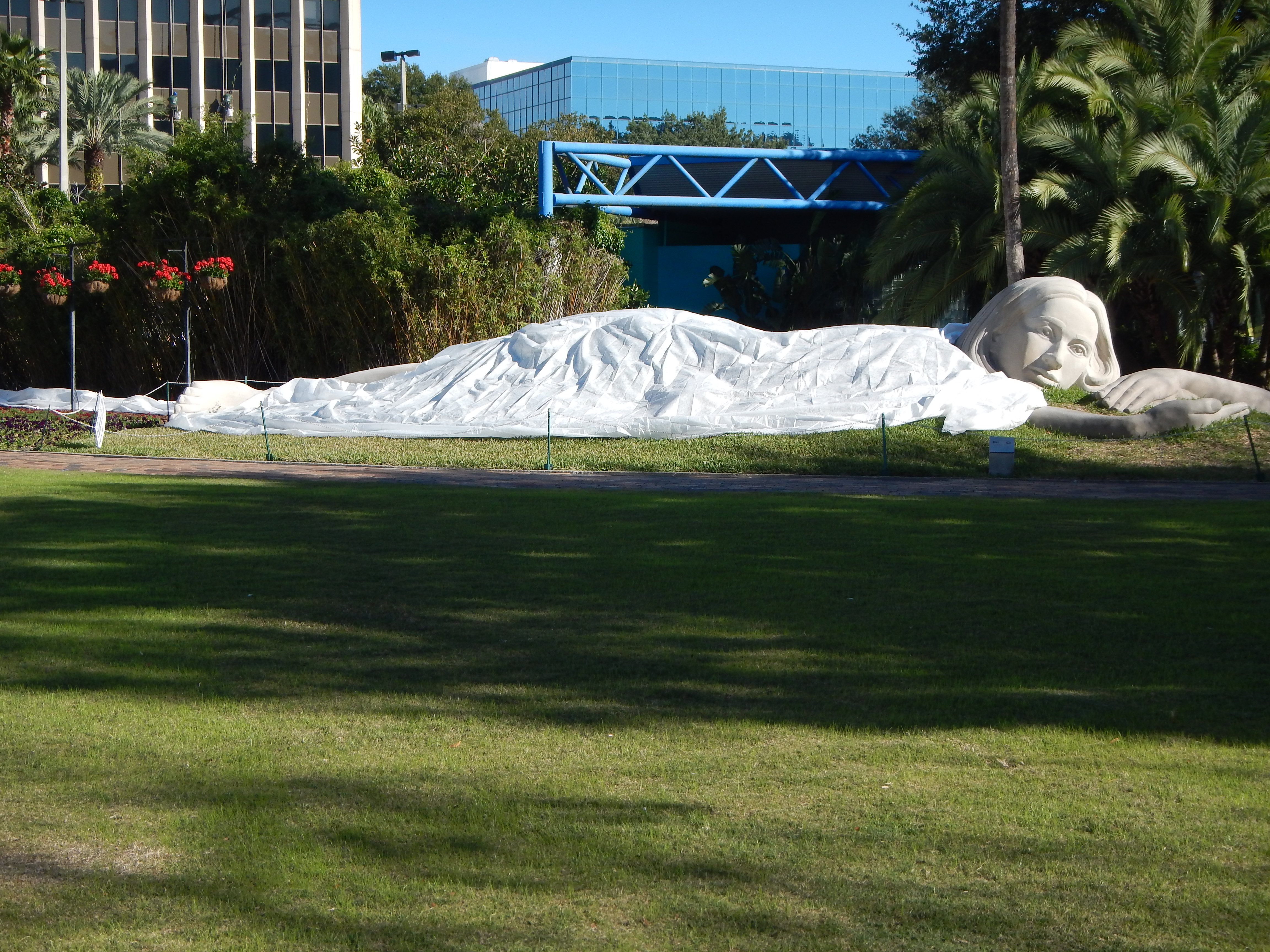 “Discovery Muse”, by artist Meg White, is an enormous body at rest with hand extended, as if inviting a weary traveler to rest in her palm. My visit on this day was during a cold snap which caused her to be blanketed with a sheet to keep the greenery covering her from the harsh temps. (Yes, Orlando winters sometimes dip into the twenties!)