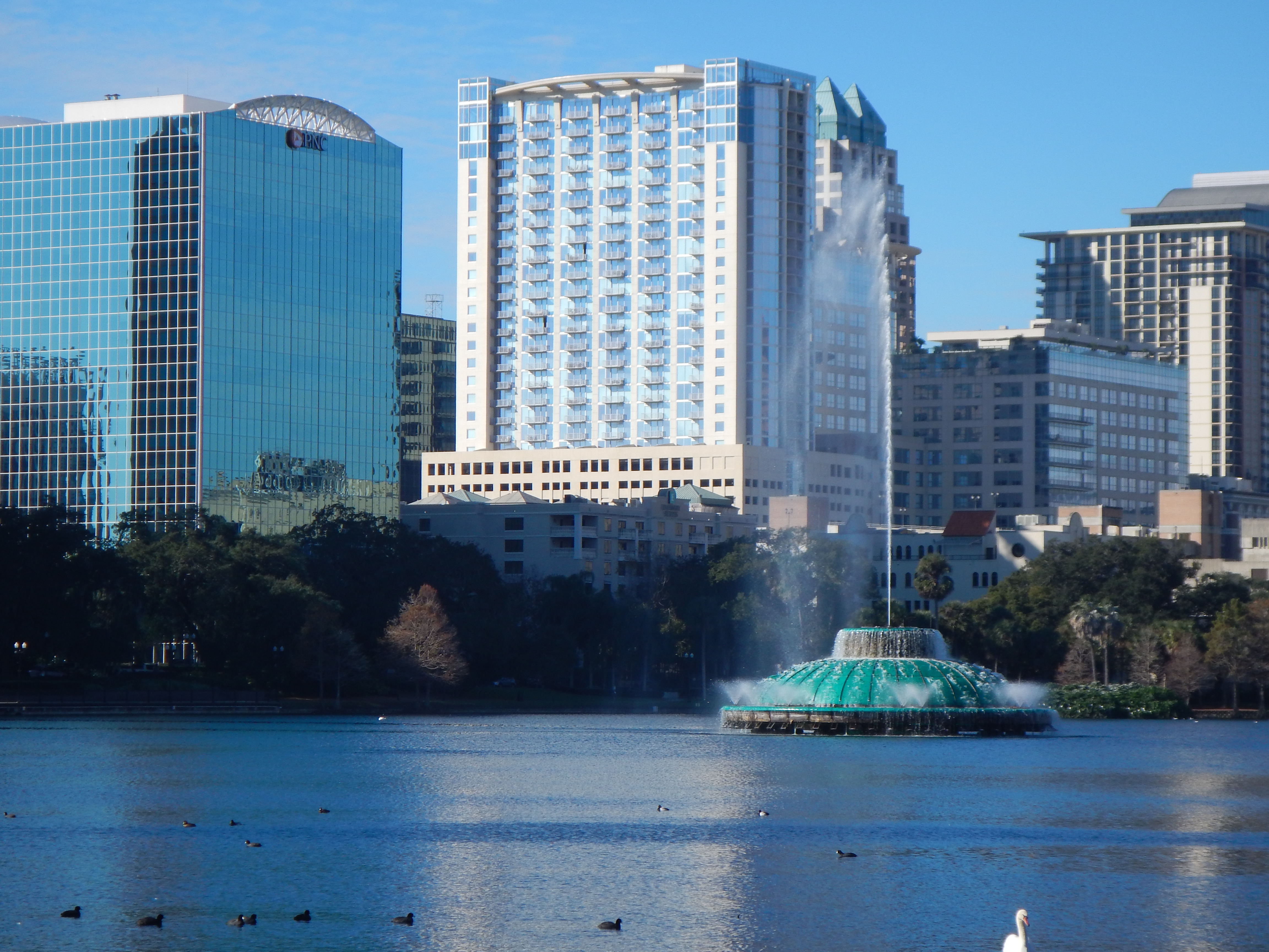 Having grown up in Orlando before the city was just a glimmer in the eye of Walt Disney, my parents would take family and friends visiting from the North to Lake Eola, in the heart of downtown. The lake’s green-domed fountain was a favorite of visitors and locals alike. A nighttime drive-by provided a colorful sight, complete with oohs and ahs as the jets of water shot to heights, not quite as soaring as Lake Geneve’s Jet D’Eau, but high enough to amaze and delight. A leisurely walk around the lake was usually in order during the day where one could hop on a Swan Boat to explore the fountain close-up and take in the sights along the shore.
