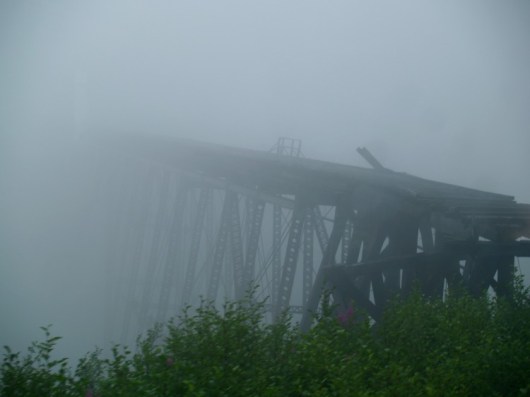 The train climbed past expansive vistas, colorful wildflowers, through tunnels and over bridges. The cloud cover was low which gave the scenery a spooky feel. Along the way there was constant narration describing some bizarre stories about the lives of railroad builders and gold diggers. The White Pass & Yukon Route climbs from sea level to almost 3,000 feet over a course of 20 miles. It’s amazing that this kind of construction could occur around the turn of the century in such harsh terrain.
