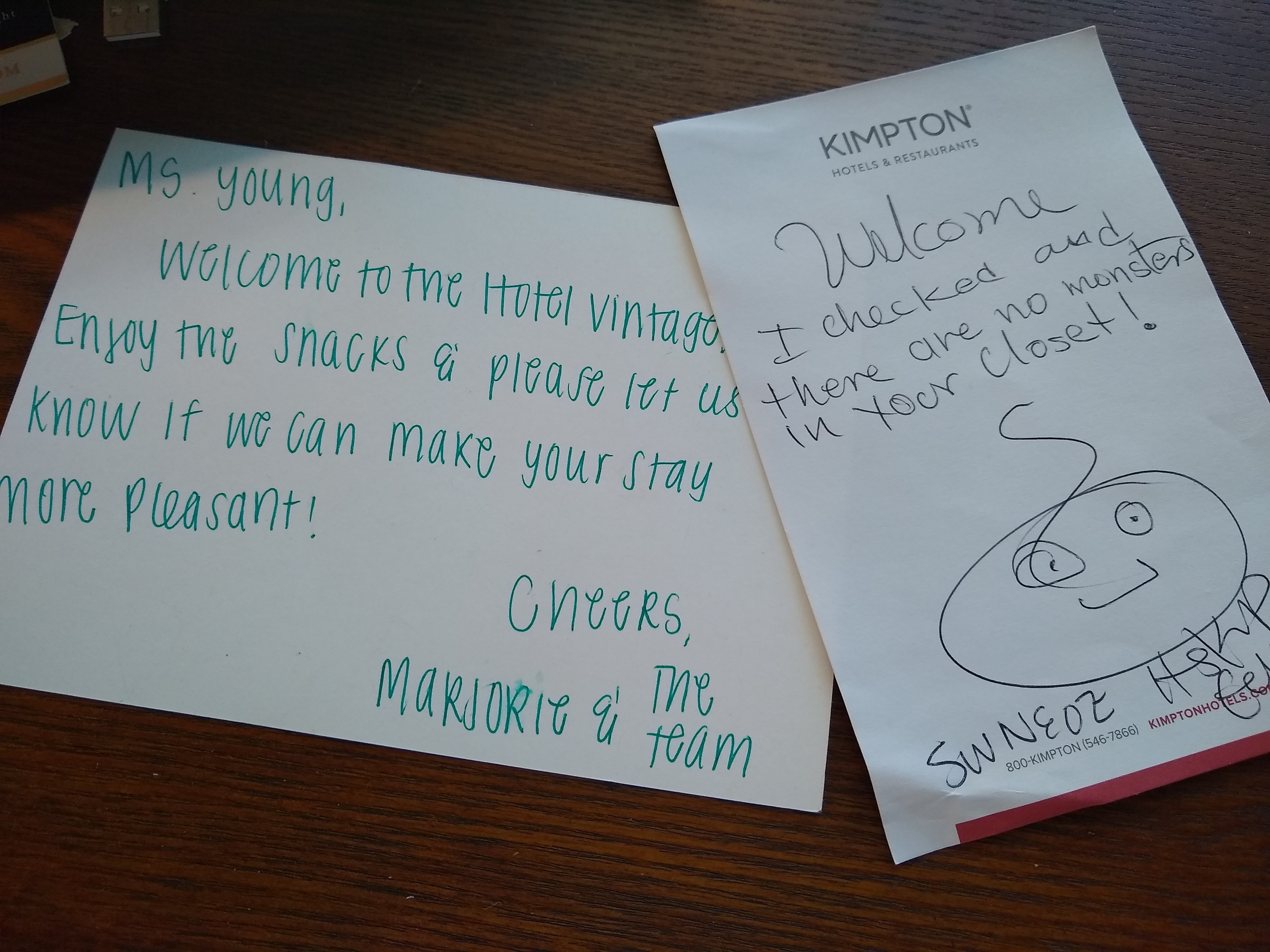 Service – First and foremost, from the moment you step into the lobby, you are treated as a special guest. Checking in is always a breeze and the personal touches you will find in your room are bound to make you feel appreciated. During a recent stay at Oregon’s Kimpton Hotel Vintage Portland, a hand-written note was on the dresser stating, “Welcome. I checked and there are no monsters in your closet!” Phew, that took care of one concern!